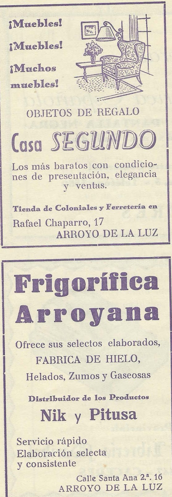 ¿Cómo no inmortalizar la fábrica de hielo y de polos de “mantecado” de Pablo Pérez? Igualmente la ferretería de Jesús Tato, donde íbamos a echar la carta de los Reyes Magos cuando se aproximaba el día 6 de enero. Los muebles de Segundo Sánchez; las mercerías de Santos Domínguez o Antonio Terrón Hernández. También vienen a mi memoria las tiendas de tejido de Olegario Ferrero, Emiliano Terrón, Víctor Reviriego y Robustiano Terrón. Los negocios de comestibles de Isidro Pérez, o la de Mendo en la Carretera. Así mismo importantes las de Dimas Rodríguez o la de Benito Ramos. ¿Cómo olvidar las churrerías de Evelino Leo en la calle Carniceros? Las tiendas de ave y huevos era de Sebastián García Martín; los almacenes de aceite de Lucio Salado y de José Lucas. Las carnicerías de Román o de Teodoro Motino. Las panaderías de Francisco Cordero y la de Vicente Cabezas en Castillejos 52. Los bancos, las empresas de autobuses de Magro o de Mena para poder ir a Cáceres. El transporte de Teodoro Carrero y las distintas dulcerías con sus exquisitos dulces arroyanos, y de las que ya hemos hablado en otras ocasiones. La pensión de la localidad de doña Cándida en la plaza, y tantas y tantas tiendas.