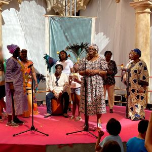 Desde un detalle del patio del palacio de Antonio de Mendoza, al grupo africano que nos ha contado un cuento de su continente.
