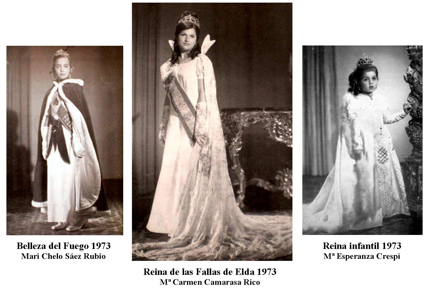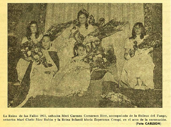 Ejercicio fallero en el que la señorita Mª Carmen Camarasa Rico ostentó el título de Reina de las Fallas 1973, estando acompañada por la Belleza del Fuego la señorita Marichelo Sáez Rubio y la reina infantil Mª Esperanza Crespí.