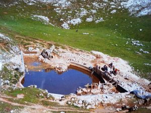 La construcción del EMBALSE DE L´ANGLIRU no fue tarea fácil, eran muchos y graves los problemas a que había que enfrentarse. En primer lugar, NO HABÍA CARRETERA O PISTA ALGUNA, que facilitara el transporte de materiales. Todo había que transportarlo a lomos de caballerías y mulos desde el pueblo de Grandiella, teniendo que subir desde los 600 m. hasta los 1.570 m. del Llagu del Angliru a través de senderos, por los que, la mayor parte de los caballos, no podían subir nada más que un saco de cemento, solamente los mulos contratados podían transportar el doble. La intendencia era fundamental en este proyecto. Al final, después de varias reuniones entre Ayuntamiento, ICONA y ganaderos, se dio el visto bueno al proyecto. La obra sería ejecutada por un grupo de ganaderos, a cuyo frente como jefe de obras estaba el albañil, Daniel Alvarez Vázquez, bajo la dirección de los Ingenieros del ICONA; el Ayuntamiento se encargaría de coordinar el transporte y la intendencia, haciéndose cargo del resto de materiales que no pudieran abonarse con las aportaciones económicas de los ganaderos y del ICONA. La Obra se llevó a cabo durante los meses de setiembre- octubre de 1973 y se ejecutó en el tiempo record de un mes, teniendo en cuenta las circunstancias adversas en que se se realizaba. Se eligió esta fecha para permitir que el ganado pudiese prácticamente agotar la temporada de pastos, pero esto también era otra dificultad más añadida, dado que el tiempo en el otoño siempre fue muy variable y podía entorpecer la realización de la obra. De hecho así fue, tuvieron que enfrentarse alguna ventisca de nieve que estuvo a punto de llevarles las lonas que cubrían el techo de la tienda.