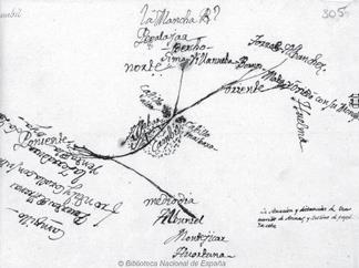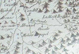 -Mapa donde se observa la ubicación del Castillo “alto” y del “más bajo” de Alhabar de Cambil, respectivamente con indicación expresa de la confluencia de los ríos Oviedo y Villanueva, dando lugar el Río Cambil en pleno centro de la villa. Al norte aparece la ubicación de la villa de Pegalajar y el Monte del Bercho –importante y rico cazadero de osos hasta la Edad Media- y la Sima de Villanueva, donde nace el referido río que se dirige a Cambil a unirse con el Oviedo, como ya queda dicho. Al Sur o al “mediodía” se encuentra identificada la villa de Arbuniel, según D. Tomás López en su Mapa de las Relaciones Geográficas de 1781, gracias a las informaciones enviadas por los Párrocos de la zona, en contestación a la Encuesta previamente recibida.