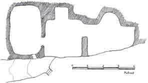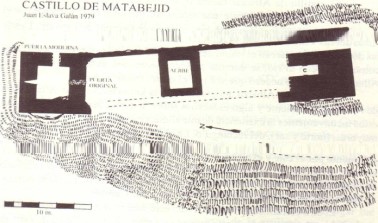 9.- Plano del Castillo de Mata Begid con indicación de la puerta originaria de la Torre del Homenaje del castillo, su aljibe y sus muros defensivos, junto a las ruinas de la actual Casería del Castillejo, según D. Juan Eslava Galán en su obra Los Castillos de Jaén (Granada, 1999).
