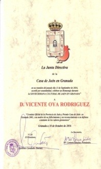 A D. Apolonio, Presidente de esta Casa que hoy me acoge en la presentación de mis dos últimos libros, que espero no sean los últimos, que cumplí su encargo realizado el pasado día 18/X/2016, cuando a la finalización de las intervenciones que con motivo del primer homenaje póstumo que se le tributó a D. Vicente Oya Rodríguez, con la participación de los Cronistas e Investigadores de Alcaudete, de Bedmar-Garciez y de la Real Carolina, aquí presentes, le hice entrega a su viuda, Dª. Isabel Jiménez Cuadros, del Diploma que esta Casa le otorgó en reconocimiento de su intensa labor cultural y social que a lo largo de su vida había desarrollado el amigo Vicente y el cariño que demostró siempre hacia esta Casa de Jaén en Granada, al tiempo que os transmito el agradecimiento de la familia de D. Vicente por el otorgamiento de tal distinción.