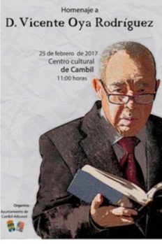 -Cartel del Homenaje Nacional póstumo que el Ayuntamiento de Cambil-Arbuniel organizó, con gran éxito, el pasado día 25/II/2017 en la Casa de la Cultura de la villa de Cambil, donde quedó como recuerdo una placa que recordará para siempre la obra que D. Vicente Oya Rodríguez realizó a lo largo de su vida por su villa natal, por Jaén y por toda su Provincia.