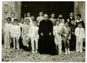 El arcipreste Joaquín Garzón Carmona, rodeado de primocomulgantes en la puerta de San