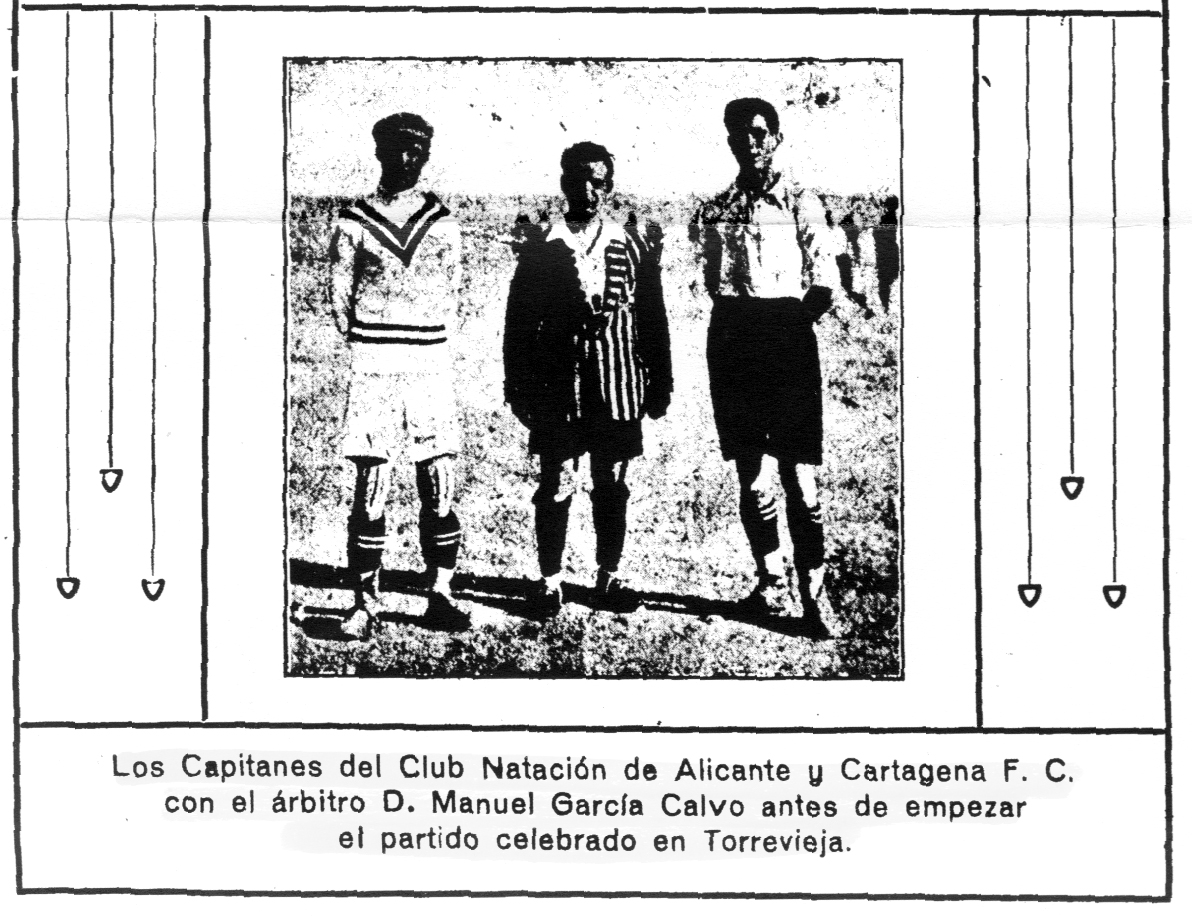 Las dos tardes que jugó el Cartagena F.C. en Torrevieja, tuvo la desgracia de que el “Natación” de Alicante, fuera favorecido con la elección de campo. El primero jugado el 25 de julio fue arbitrado por Manuel García Calvo.
