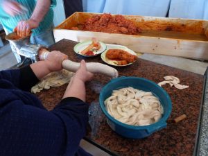 Bien temprano se oía el gruñido del animal que atrapado por el gancho era aupado al Gólgota de la mesa del sacrificio. El ancho cuchillo matancero penetraba en la papada y un caudal de sangre caía en el barreño, que con el removido e ingredientes todo acababa en mondongo. El fuego de la albolaga iniciaba el chamuscado y raspado. Las ollas puestas a hervir. La prueba se enviaba para que la reconociese el veterinario. Luego el despiece, separando el magro de la grasa. Se lavaban las tripas. De rodillas en las artesas la masa para chorizos y morcillas era removida y agitada sin descanso. Luego el llenado para el embutido.