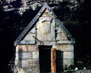 Por de pronto aquí va el registro del monumento que se contiene en esa finca del Sotillo, y que por su importancia histórica y su interés arquitectónico, debe ser preservado de cualquier daño. A mitad del recorrido del vallejo que sube a la derecha del barranco del Sotillo, camino ya de la llanada alcarreña rumbo a Miraflores y Horche, hoy escondido entre zarzas y juncos, aparece un edificio de planta rectangular, de unos tres metros de frente por seis de fondo, todo él construido de enormes sillares de piedra caliza, y cubierto por tejado a dos aguas hecho también con fuertes losas de piedra. En su frente aparece un vano arquitrabado cerrado por puerta metálica. Sobre la puerta, en el triángulo que queda entre ella y las dos aguas del tejado, surge tallado en piedra, y muy bien conservado, el escudo del duque del Infantado, con los blasones de Mendoza y Enríquez, rodeado de una leyenda de casi imposible lectura, pues los siglos han ido diluyendo la superficie de las piedras hasta dejar tan sólo algunos trechos en los que se leen cosas como «este agua del Sotillo» y «para la ciudad». Nada más. El nombre de quien lo hizo, y el año, son indescifrables.