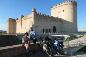 Rodeados por esa naturaleza y ese poso histórico alcanzan los ciclistas Arévalo, un lugar que pudo ser la capital de un reino y que hoy ofrece al visitante, entre sus muchos atractivos que son vestigio de muchos siglos de intensa historia, sus iglesias, su plaza de la Villa y su castillo, con un mudéjar único en la península. Ofreciendo una pequeña lección de Historia, Carolina y Carlos cuentan que Arévalo se fundó en la confluencia de los ríos Adaja y Arevalillo, desempeñando un lugar destacado en la frontera entre Castilla y León. Su castillo fue levantado en este emplazamiento y el infante Alfonso, hermano de Isabel la Católica, estableció su corte en él. De haber vencido a su hermanastro, Enrique IV, en la guerra por el trono de Castilla, hubiera reinado como Alfonso XII, y de no haber perdido la vida por la peste, o probablemente debido a un envenenamiento, la historia de España hubiera sido muy distinta y, tal vez, su capital o del país que hubieran formado León y Castilla estuviera aquí, en Arévalo.