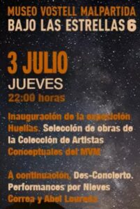 Informaros que el día 3 de julio, jueves, a partir de las 20:30 horas, damos el pistoletazo de salida al programa «BAJO LAS ESTRELLAS 6» y a lo hacemos a lo grande, con la inauguración de la exposición «HUELLAS», una selección de obras de artistas de nuestra colección conceptual, esencia del MVM, y la sesión de performances «DES-CONCIERTO» a cargo de los extraordinarios Nieves Correa y Abel Loureda. Pasaréis un rato del que tendréis mucho que contar. Paso lista.