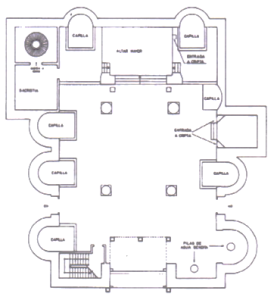 El piso bajo fue utilizado como Sacristía y Archivo. Una de las novedades de esta Torre-Campanario es el paso del cuadrado de su primer cuerpo al polígono del segundo cuerpo, el cual se hace a través de cuatro trompas con decoración de calaveras y de ángeles.