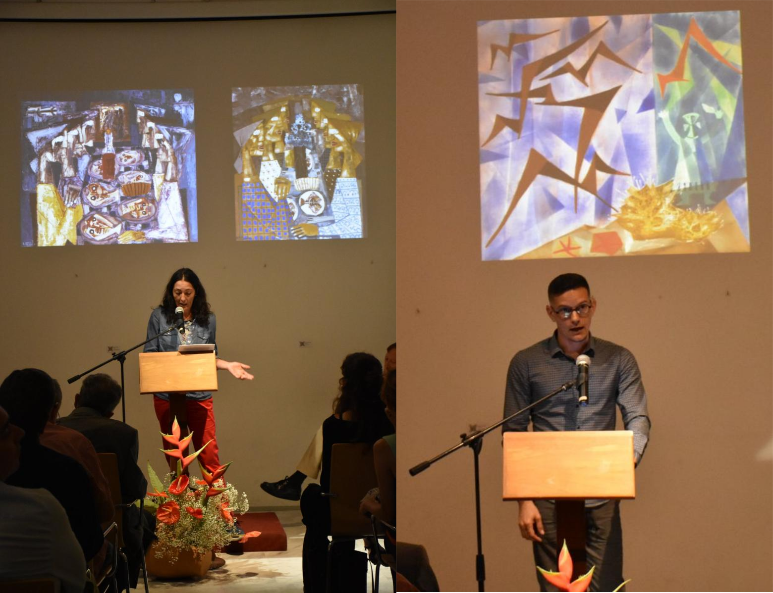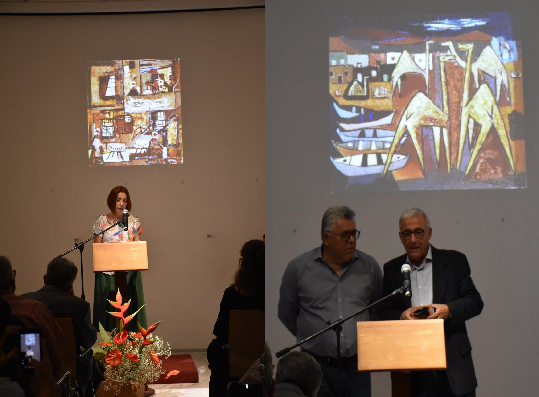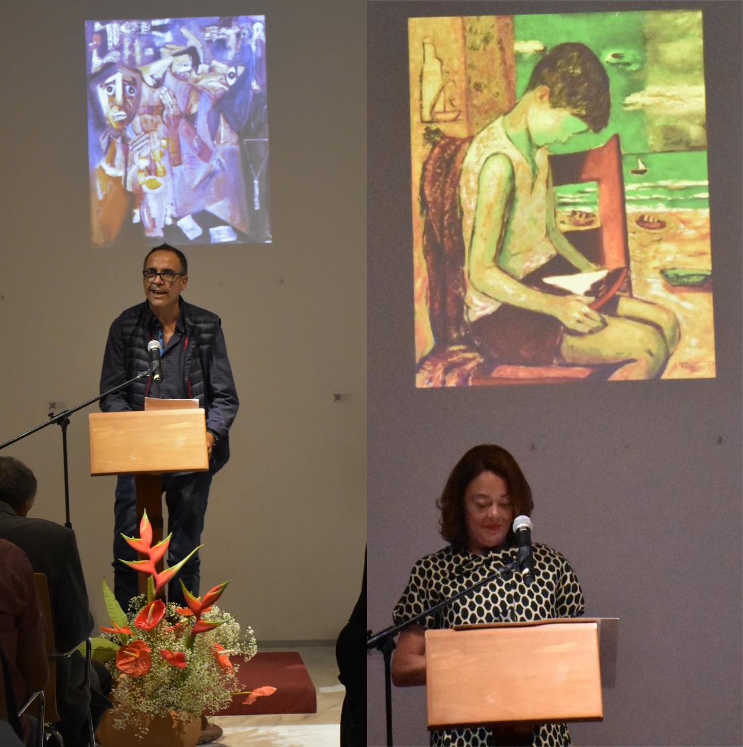 Se inicia el turno de las intervenciones, y es Cristóbal García del Rosario el que comienza. El cuadro elegido para la ocasión representa un paisaje agrícola, donde se muestran las cucañas y la división de las parcelas, sin perder de vista las cabras. Pues bien, a partir de ahí, como buen profesor de Arte, hizo un pormenorizado análisis de la obra, haciendo hincapié en otros aspectos relacionados con el pintor de Gáldar. De la trayectoria de García del Rosario glosó Manuel Díaz.