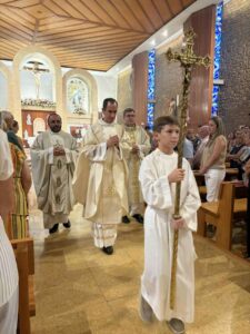 En el interior del templo, se entonó por el coro y la feligresía el Himno de Santa Bárbara, patrona de Casinos, para la procesión de entrada y los ritos iniciales en los que el nuevo Cura-Párroco, hizo su profesión de fe y promesa de fidelidad a la Iglesia, recibiendo posteriormente los Santos Evangelios.