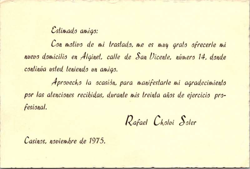 Era el mes de noviembre de 1975, cuando Don Rafael Cholvi Soler, dejaba aquella farmacia de la Plaza Mayor de Casinos, para seguir ejerciendo su profesión en su ciudad natal de Alginet. Tal y como expresa la tarjeta de despedida, fueron treinta años los que pudimos gozar del cariño, de la amistad y de la generosidad de D. Rafael, el que no solo fue nuestro farmacéutico, sino que formó una familia, junto a su esposa Maruja y sus dos hijos Rafael y Felipe de los que aun gozamos de su amistad.