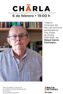 La Sala del Ámbito Cultural el Corte Inglés de Badajoz acogerá el próximo jueves, 6 de febrero, a las 19,00 h, la charla “Viaje al Virreinato del Perú del jerónimo guadalupense fray Diego de Ocaña (1599-1608”, que ofreceré en calidad de Cronista Oficial de Montijo y Lobón. La charla forma parte de la ponencia que con el mismo título presenté en los 51 Coloquios Históricos de Extremadura, celebrados en Trujillo; siendo galardonada con el XXVIII Premio de la Fundación Obra Pía de los Pizarro.