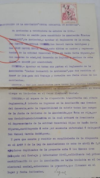Don Daniel Caldevilla Bermejo, don Manuel García Rodríguez, don José Manuel Hevia García (en representación de los hijos de don Ramón Hevia Miyares) constituyeron la Asociación “Centro Mercantil de Arriondas” el día 27 de octubre de 1935.