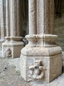 Se trata de unas figuras humanas y de animales realizadas en el siglo XII, cuyo significado es un enigma. Normalmente estas figuras decoran los capitales historiados de la mayoría de los claustros pero no los pies de las columnas sobre las que se sustentas estos capiteles. Para mí es una rareza desconcertante y hermosa con la que he disfrutado mucho y que os invito a conocer.