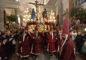 El Perdón, entretanto, tampoco desfilará solo. Lo acompañaran treinta nazarenos magentas, quince a cada lado del trono, y una representación de regidores delante, junto a dos acólitos. Detrás, si no se decide otra cosa sobre la marcha, se formará otra presidencia formada por el párroco de San Antolín y las autoridades que la cofradía designe.