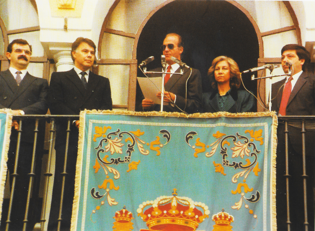 Y el 16 de febrero de 1997 visitaron Dos Hermanas los Reyes Don Juan Carlos I y Doña Sofía, para inaugurar el monumento erigido por el Ayuntamiento en la plaza de la Constitución con motivo del Décimo aniversario de la instauración de la Corona. Desde el balcón del Ayuntamiento, acompañados por Felipe González, en aquella fecha Presidente del Gobierno, el Rey envió un mensaje a España en el que, entre otras cosas, dijo: