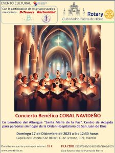 El Club Rotario de Madrid Puerta de Hierro organiza un concierto benéfico el domingo 17 de diciembre a las 12,30 horas en la capilla del Hospital de San Rafael, en la calle Serrano, número 199. El concierto será en beneficio del Albergue “Santa María de la Paz, centro de acogida para personas sin hogar de la Orden Hospitalaria de San Juan de Dios que cuida a personas pobres sin hogar.
