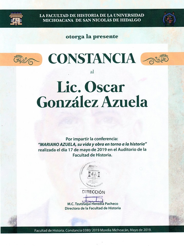 Mi agradecimiento a la Facultad de Historia de la Universidad Michoacana de San Nicolás de Hidalgo, en especial a mi amigo el maestro Eugenio Mejía Zavala, por su invitación a presentar a sus alumnos una visión de Mariano Azuela en torno a la historia; un gusto estar en esa bella y emblemática ciudad.
