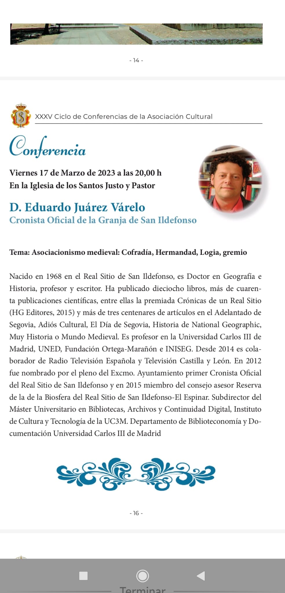 COMUNICADO DE LA CONFERENCIA QUE DARÁ EDUARDO JUÁREZ VALERO, CRONISTA OFICIAL DEL REAL SITIO DE SAN ILDEFONSO (SEGOVIA).