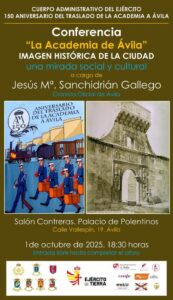 «La historia de un vínculo inquebrantable», lema del aniversario de los «150 años del traslado de la Academia del Cuerpo Administrativo del Ejército a Ávila», es el motivo que nos sirve para recrearnos en la imagen histórica que tal acontecimiento ha proyectado en la ciudad a lo largo del tiempo, desde un punto de vista social y cultural, tema sobre el que trata la conferencia que tendrá lugar el próximo miércoles, día 1 de octubre, en el Palacio de Polentinos a las 18:30 h. a cargo del Cronista Oficial de Ávila, Jesús Mª Sanchidrián Gallego.