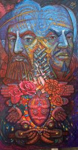 La obra comisionada y donada por la “Asociación de Alcaldes del V centenario” con sede en Madrid, y de la “Fundación  Carlos Terres” de México, para ser instalada en la villa de Medellín de Extremadura, lugar de nacimiento de Hernán Cortés, será  un mensaje de buena voluntad, como un saludo amistoso  y fraternal de México  a España , por medio de colores y líneas de autentico sabor mexicano, esta pintura recrea el encuentro entre Hernán Cortes, “El extremeño  que se volvió indígena” y Moctezuma “El señor sobre todos los señores y el mayor de todos”, personajes polémicos que viven hasta hoy entre la infamia y la gloria , vencedores y vencidos anudados en una misma realidad, engalanados por la rosa de Castilla y el cempazuchitl, flores engarzadas a sus cuellos, formando parte del collar de manos y corazones, que une y acrisola en dramática, portentosa y sincrética  simbiosis, los latidos mestizos de un solo corazón.