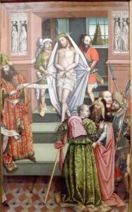 En la pintura, Jesús aparece en el centro, con las manos atadas, en actitud resignada. Cristo va sucintamente vestido de sencilla túnica y aparece en actitud sumisa, frente al gobernador Pilato que, revestido de elegantes túnicas, y tocado de un singular gorro de influencia oriental, se muestra poderoso. A ambos les rodean una serie de figuras que son soldados, sayones, un escriba y algún sacerdote, con rostros que manifiestan sorpresa, resignación o, la mayoría de ellos, soberbia y maldad. Un detalle del cuadro presenta una referencia al evangelio de San Mateo (27:19) cuando dice que durante el juicio a Cristo, la esposa de Pilatos, llamada Claudia Prócula, intercedió por el reo, advirtiendo a su marido que se desentendiera del caso, que ese hombre era justo, y en sueños había visto que habría problemas si le condenaba. Algunas iglesias orientales han considerado santa a Claudia Prócula por esta advertencia. En la tabla que comento, el detalle es contundente: sobre el muro que da a la sala donde se juzga a Cristo, aparece una ventana enrejada, y tras ella dos mujeres. Una (se supone que es Prócula) parece llorar y de su boca sale una frase escrita sobre pergamino que dice “nihil tibi et iusto illi” (nada hagas a ese hombre porque es justo) y tras ella se ve a una joven que la acompaña. Ella viste un completo ajuar medieval, propio de la mitad del siglo XV, tocándose con el típico tocado de cuernos que consistía en sendas trufas laterales, cubiertas de crespinas y amparadas por una toca rosada de bordes festoneados.
