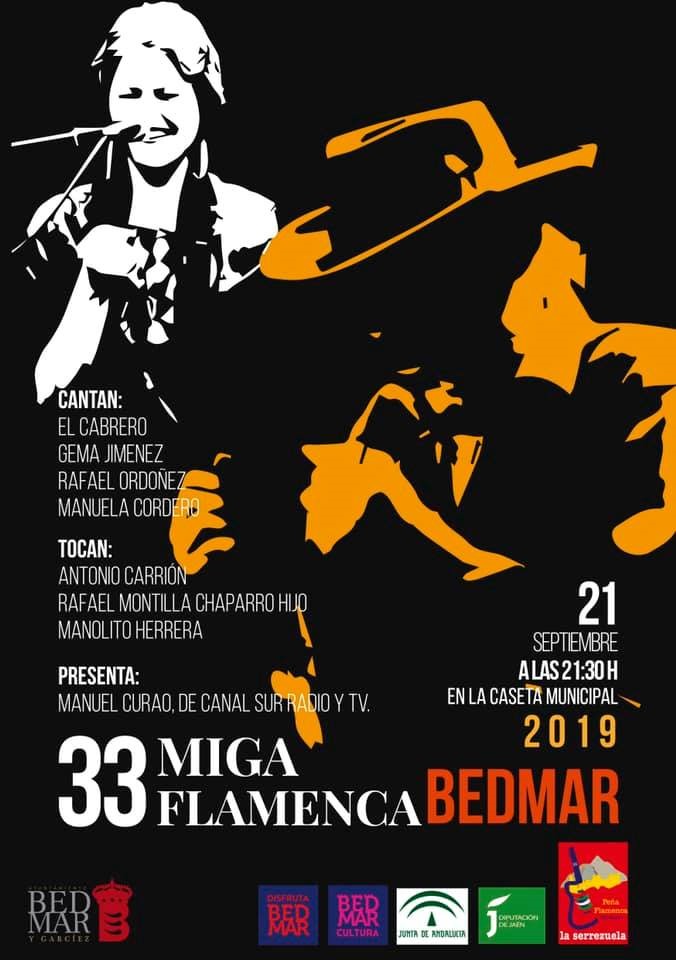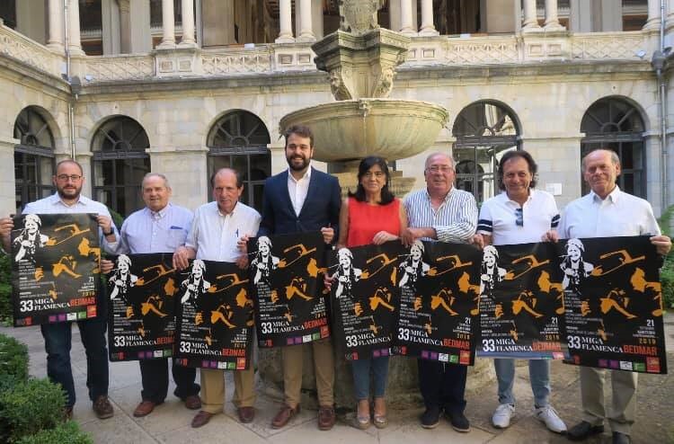 En Jaén y en Bedmar, el 2/VIII/2019 tuvo lugar la presentación oficial de la 33 Miga Flamenca de la Peña “La Serrezuela” de Bedmar.– El día 2/VIII/2019, en la Diputación Provincial, por la mañana, el Alcalde de Bedmar y Garciez y Diputado Nacional por Jaén, D. Juan Francisco Serrano Martínez y el Concejal de Cultura, D. Pablo Ruiz Amezcua, acompañados por el Presidente de la Peña Flamenca “La Serrezuela”, D. Esteban Marín Tortosa y D. Ildefonso Narváez como miembros de su Directiva, junto a D. Rafael Ordóñez y D. Antonio Carrión, como miembros del cartel de esta edición y de la Vicepresidenta de la Diputación de Jaén, Dª. Paqui Medina, presentando a los medios de comunicación y prensa, el Cartel de la XXXIII Edición de la MIGA FLAMENCA que se celebrará el día 21 de septiembre de 2019 en la Caseta Municipal “4 de Diciembre de 1977” de Bedmar, dentro de las Ferias y Fiestas Patronales en honor de la Santísima Virgen de Cuadros, Patrona y Alcaldesa perpetua de la Villa.