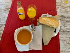Me prometí hacerlo con un gazpacho andaluz fresco, una Fanta de naranja con una rodaja natural de esta fruta. Una gallina a la cacerola acompañada de papas a la francesa y una rebanada de melón de Onteniente o de oro.