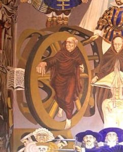 En efecto, ahí aparece, recostado sobre una rueda de madera. Eso significa que sus grandes contribuciones fueron la introducción de la rueda aplicada al transporte y la adaptación de los caminos reales para que se pudiera usar con carretas.
