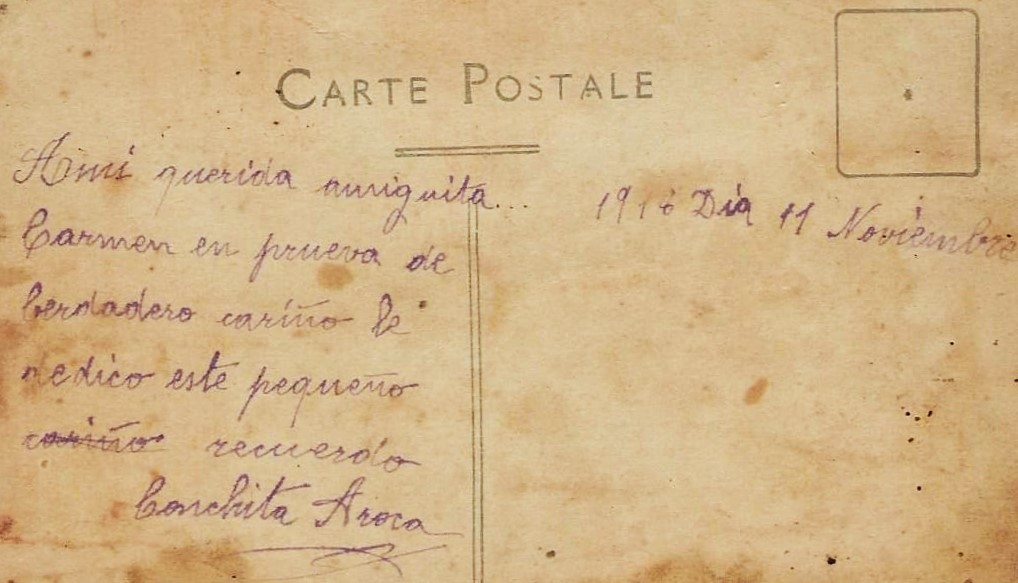 En el reverso se puede leer: «A mi querida amiguita Carmen en prueba de verdadero cariño le dedico este pequeño recuerdo» firmado Conchita Aroca. Mi abuela debería tener 16 o 17 años, dado que como mi abuelo, seguían año a año el siglo.