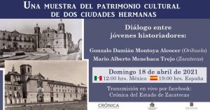 Las ciudades hermanas: #Orihuela (España) y #Zacatecas (México), vamos a conmemorar el Día Internacional de los Monumentos y los Sitios con un diálogo entre dos jóvenes historiadores.
