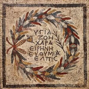Les comparto este mosaico de Halicarnaso (actual Bodrum) que representa una corona con inscripciones griegas: «Salud, Vida, Alegría, Paz, Buen Ánimo, Esperanza». Creado en el siglo IV d. C., actualmente se encuentra en la colección del Museo Británico.