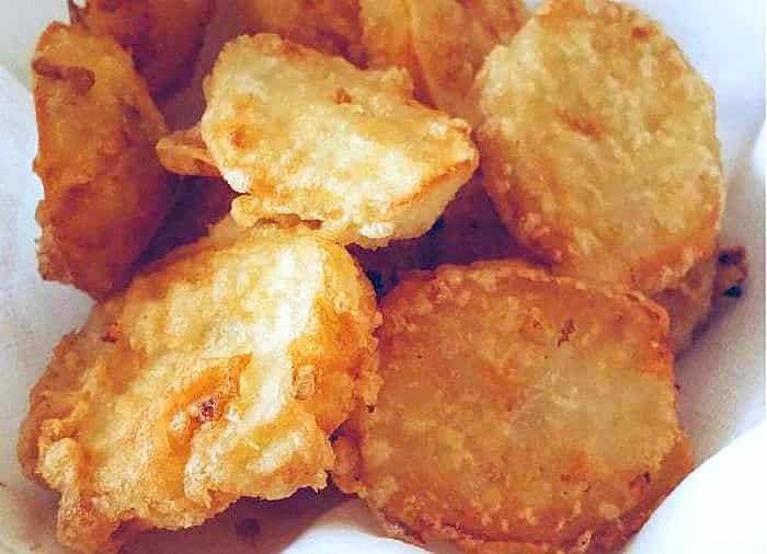 1.- CHULETITAS O ESCALOPINES DE HUERTA. Ya peladas, corten en rodajas no muy finas unas cuantas patatas de tamaño medio grande. Salen al gusto y medio fríanlas en aceite. Cuando estén bien pochadinas, pero no «turradines», rebócenlas en harina y huevo batido, vuelvan a freirlas y colóquenlas en una cazuela de barro.
