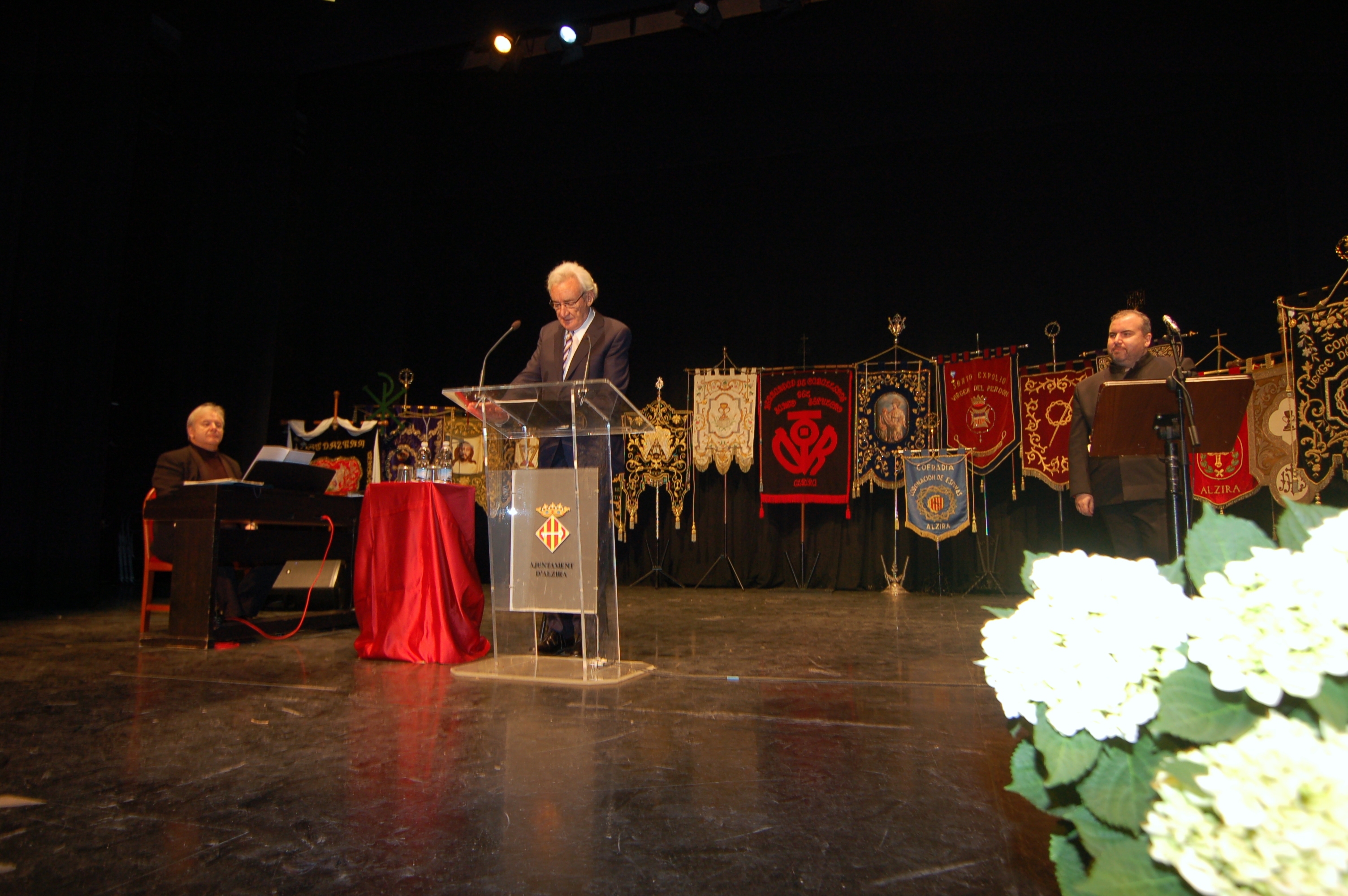 El reconocido periodista y locutor de radio leonés Luis del Olmo fue el encargado de dar el pistoletazo de salida a la Semana Santa alcireña al pronunciar ayer el pregón, uno de los actos más importantes de las fiestas litúrgicas de la capital de la Ribera. El informador recitó desde el escenario de un Gran Teatre lleno absoluto, acompañado por la música del barítono Luis Santana y del pianista Antonio López Serrano en lo que se denominó un pregón-concierto, un discurso que describió a la perfección no solo los actos de la pasión que se representan en Alzira, sino el fervor con el que se vive la Semana Santa alcireña. Además, también animó a todas las cofradías y hermandades a disfrutar de las fiestas.