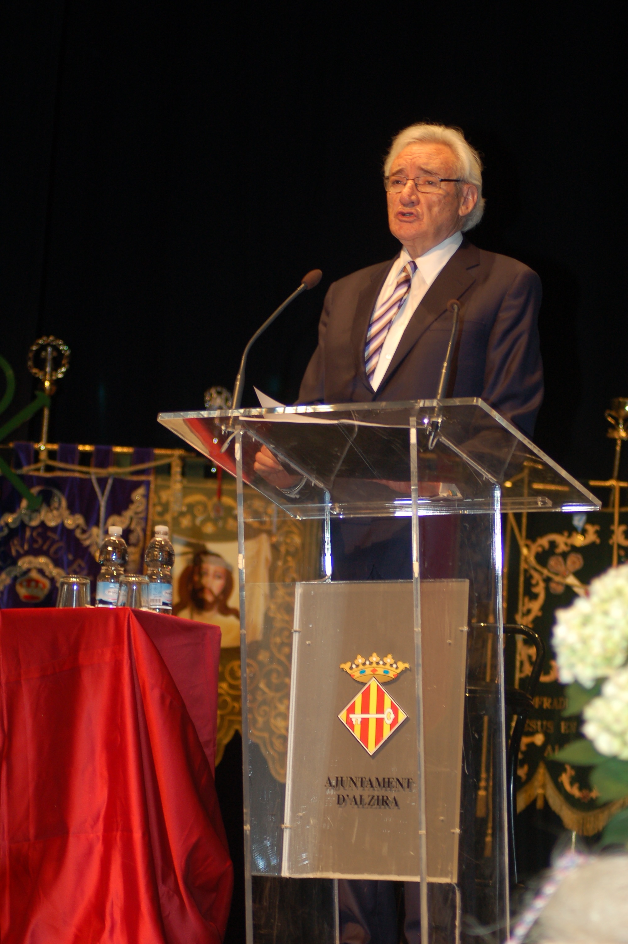 Como no podía ser de otro modo, Del Olmo inició su plática recordando la célebre frase con la que se dio a conocer y que repetía en todas las ediciones de su programa Protagonistas. «Buenos días, España. Les habla Luis del Olmos y les invitamos a una nueva edición de Protagonistas, desde Alzira», comenzó. El locutor leonés describió la Semana Santa alcireña como «una fiesta donde todo Alzira sale a la calle». De hecho, afirmó que pudo comprobarlo en la procesión del encuentro del viernes. Del Olmo prosiguió numerando algunas de las características que hacen de la fiesta alcireña un bien de interés turístico, como «la tamborrada, los vía crucis, los doseles, el toque de silencio, las peladillas, los caramelos», y citó a las 18 cofradías y hermandades que conforman la junta alcireña.