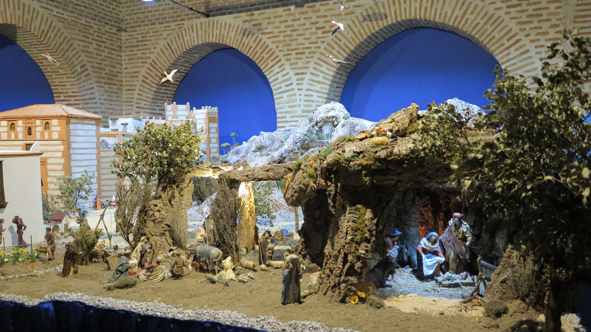 Muchas sensaciones me han llegado de la memoria infantil cuando estaba admirando este Belén monumental instalado en el patio cubierto de nuestro Ayuntamiento, obra de los belenistas Fran Ramos e Iván Antonio. Sencillamente extraordinario. Es un Belén muy elaborado con espacios y ambientes variados y bien integrados, desde el pueblo amurallado al estilo mudéjar, con la Puerta de la Villa o del Alcocer arevalense, un túnel profundo de trampantojo, a las casas al estilo palestino, con sorpresa incluida, o las elevadas montañas con manantial y cascada espectacular, o el paisaje desértico con palmeral, o las grutas rocosas de roñas y corchos, un laberinto de escenas y pasajes, con el ángel anunciador a los pastores, refulgente… para llegar al misterio, una gruta con fuente de agua incluida que es mitad arquitectura mitad gruta rocosa, que crea un ambiente especial para las figuras principales de todo belén, con los adoradores más tempranos. ¡Qué embelesamiento! Y que recuerdos de la niñez.