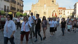 Pero, volviendo a La Caminanta, el año pasado sólo se celebraron las eucaristías, en día de la fiesta y la de difuntos cofrades, para traer la imagen en un vehículo a la parroquia de Santo Domingo, eso sí, con la exposición de la imagen a la veneración cofrade y popular durante toda la semana en el templo parroquial. Este año, aunque está mejorando el panorama, las normas de precaución de la pandemia no permiten procesiones ni concentraciones, que en esos casos son inevitables, se ha celebrado de la misma manera, y se ha repetido el sistema, ante la pena de todos y la resignación de muchos. Pero nos faltó todo lo que rodeaba esta antigua y arraigada tradición, los traslados procesionales con la gaitilla y el tamboril, esa música tan nuestra, y los dulces sones de “la Procesión”, el virtuosismo lleno de símbolos de nuestras raíces musicales, pura tradición… Y la misa de difuntos, la misa campestre con jotas en la era, también en la parroquia, el recuerdo a los que nos precedieron. Qué bien luce esta querida imagen, tan adornada de flores y con vestido nuevo, en las gradas del presbiterio.