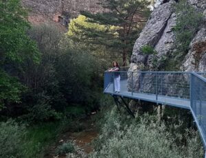 Raquel por el desfiladero de la Yecla, al que fuimos caminando desde Santo Domingo de Silos, en el parque natural Sabinares del Arlanza; hablamos de la sabina albar, la «juniperus thurifera», es decir, productora de incienso, del que fuimos bien servidos en la Abadía. También encontramos encinas, rebollos, quejigos y en lo alto de las peñas buitres leonados.