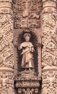 En su escultura del siglo XVIII que hermosea la fachada de este recinto podemos observar que tiene 9 elementos que forman parte de su indumentaria y de sus atributos iconográficos, de hecho, es el personaje que más posee en este maravilloso retablo de cantera: