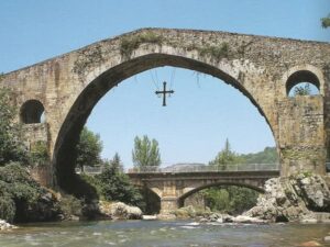 Seguro que la más fotografiada réplica de la Cruz de la Victoria -aquí en Asturias- sea la que pende del arco central del puente medieval -más conocido desde hace apenas un siglo como puente “romano”-, el que abraza y une los concejos de Cangas de Onís y de Parres.