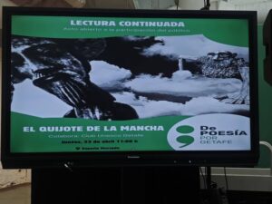 En la lectura continuada del Quijote, intervinieron. Primeras autoridades del Ayuntamiento y otros directivos y responsables de diferentes Asociaciones y entidades culturales de Getafe, destacando los alumnos y alumnas del Colegio «Divinas Pastoras de Getafe» y alumnos de la Escuela Taller «Destellos»