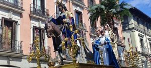 En Madrid sale hoy el Paso de la Borriquita que data de 2011 y se encuentra en la Catedral de la Almudena. Este Paso pertenece a la iglesia de San Ildefonso. Desde esta iglesia, fue trasladado el pasado sábado día 16 hasta la Catedral de la Almudena, para procesionar hoy Domingo de Ramos por las calles de Madrid, iniciando su recorrido en la Catedral. En las dos imágenes que presentó al final de esta crónica, tomadas por mí el pasado día dieciséis, se puede observar la belleza y grandeza de este paso y además podemos ver también a todos los costaleros que lo transportan a hombros, que van cubiertos por las telas de color rojo que les cubren, aunque a la altura de los ojos queda todo un perímetro transparente para que los costaleros puedan ver al maestro que les conduce y el lugar por donde van.