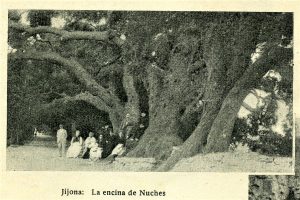 «Otro gigante vegetal se encuentra cerca de la fuente de Nuches, y es una colosal encina de bellotas dulces, que debe también contar varios cientos de años, pues el tronco achaparrado es de enormes dimensiones, oculto hoy casi totalmente al terraplenar la depresión en que había nacido, para poner a nivel un paseo de la finca. En el día se puede ver la parte superior del gruesísimo tronco, a manera de pedestal de cinco ramas, la menor de las cuales pasaría por una robusta encina.