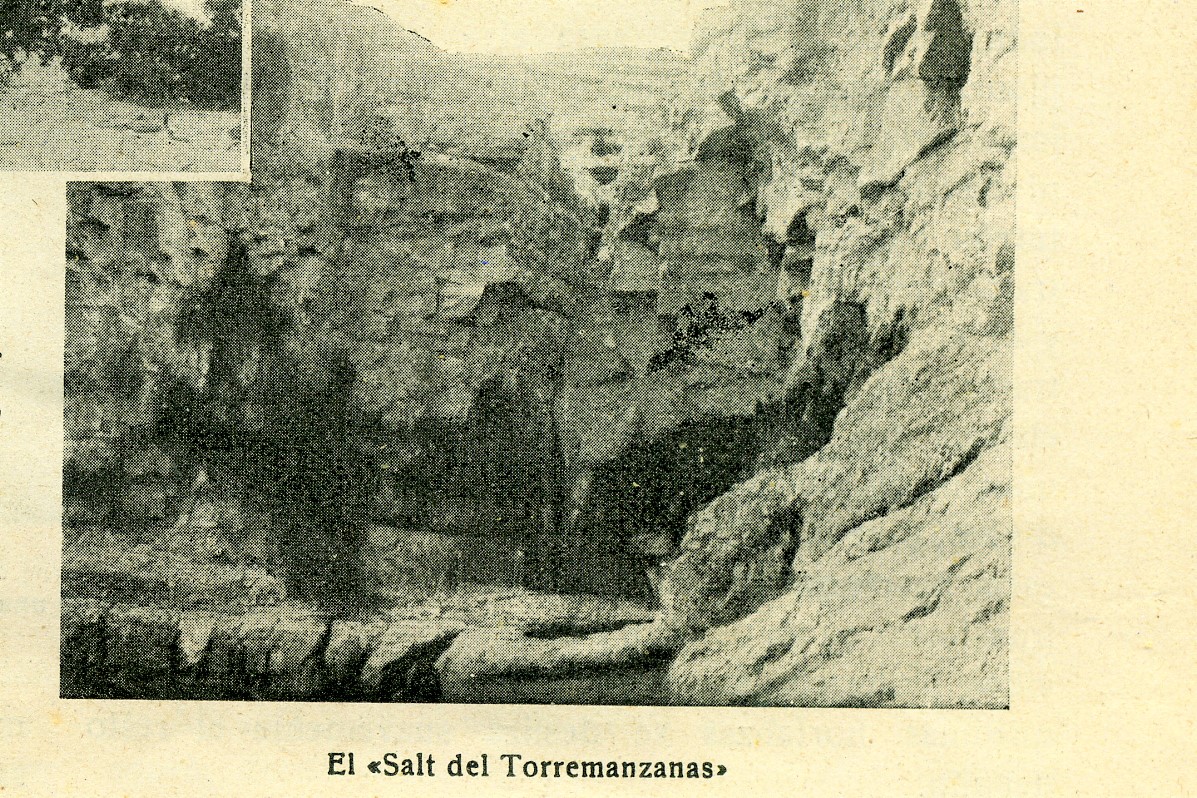 «El (río) Torremanzanas forma grandes precipicios antes de unirse al Coscó, y uno de los puntos que merece visitarse es el Salt, que en tiempos de lluvia forma una espumosa catarata. El río, que corre entre margas cenomanenses, encuentra unas capas de calizas fuertes, suavemente inclinadas al N, es decir, en sentido contrario a su dirección. Una falla corta estas capas al S, y las aguas han tenido que roer el borde de estas bancadas calizas para precipitarse por la quebrada, encontrando después zonas más flojas, formando un profundo cañón.