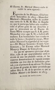 Tal día como hoy, el conde Guilleminot, dirigía la siguiente carta al mariscal Moncey: «Egército de los Pirineos = Chiclana 28 de Setiembre de 1823. = Monseñor Mariscal= Monseñor acaba de recibir una carta de S. M. El Rey de España en que le participa haber sido restablecido al pleno goze de sus derechos y que se presentará en el Puerto de Santa María siempre que S. A. R, se hallará allí mañana. Las hostilidades han cesado en toda la línea. = Aceptad os ruego, Monseñor Mariscal la seguridad de mi respeto. = El Mayor General. = Conde Guilleminot. = Al Excmo. señor Mariscal Moncey Duque de Conegliano.