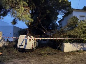 No ha defraudado «Leonardo» con su previsión. La madrugada ha sido de fuerte viento y lluvia, a veces intermitente en intensidad. A esta hora, –8,00– continúa la borrasca azotando a la población, que ha amanecido con la sorpresa de algunos árboles caídos. En la zona de la Huerta Alta, a las cuatro horas aproximadamente, un pino se ha derrumbado sobre la pared de la valla de un chalet y un vehículo industrial, sin lamentar desgracias personales. La actuación de los bomberos ha permitido que el paso de personas y vehículos este expedito y se pueda transitar, siempre con precaución, por la calle.