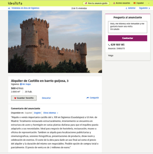 “Alquilo o vendo importante castillo en Guijosa (Guadalajara), a 125 kilómetros de Madrid.